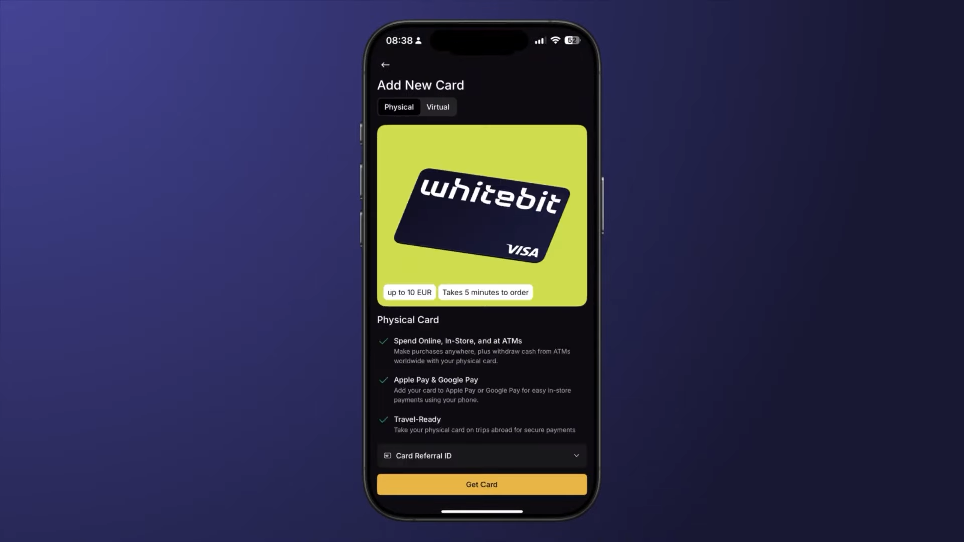 Карта пока доступна для резидентов стран Европейского союза. Эта карта позволяет тратить такие активы, как Биткоин, Эфириум, SOL и USDC, напрямую с вашего биржевого баланса на WhiteBit.